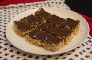 - Allow bars to cool completely in pan. When the bars are completely cool, melt chocolate chips and coconut oil together; mix until smooth. Spread on top of bars and wait until top cools. Using parchment paper, lift bar onto cutting board. Cut into 25 pieces (5 rows of 5 bars) or 16 pieces (4 rows of 4 bars)